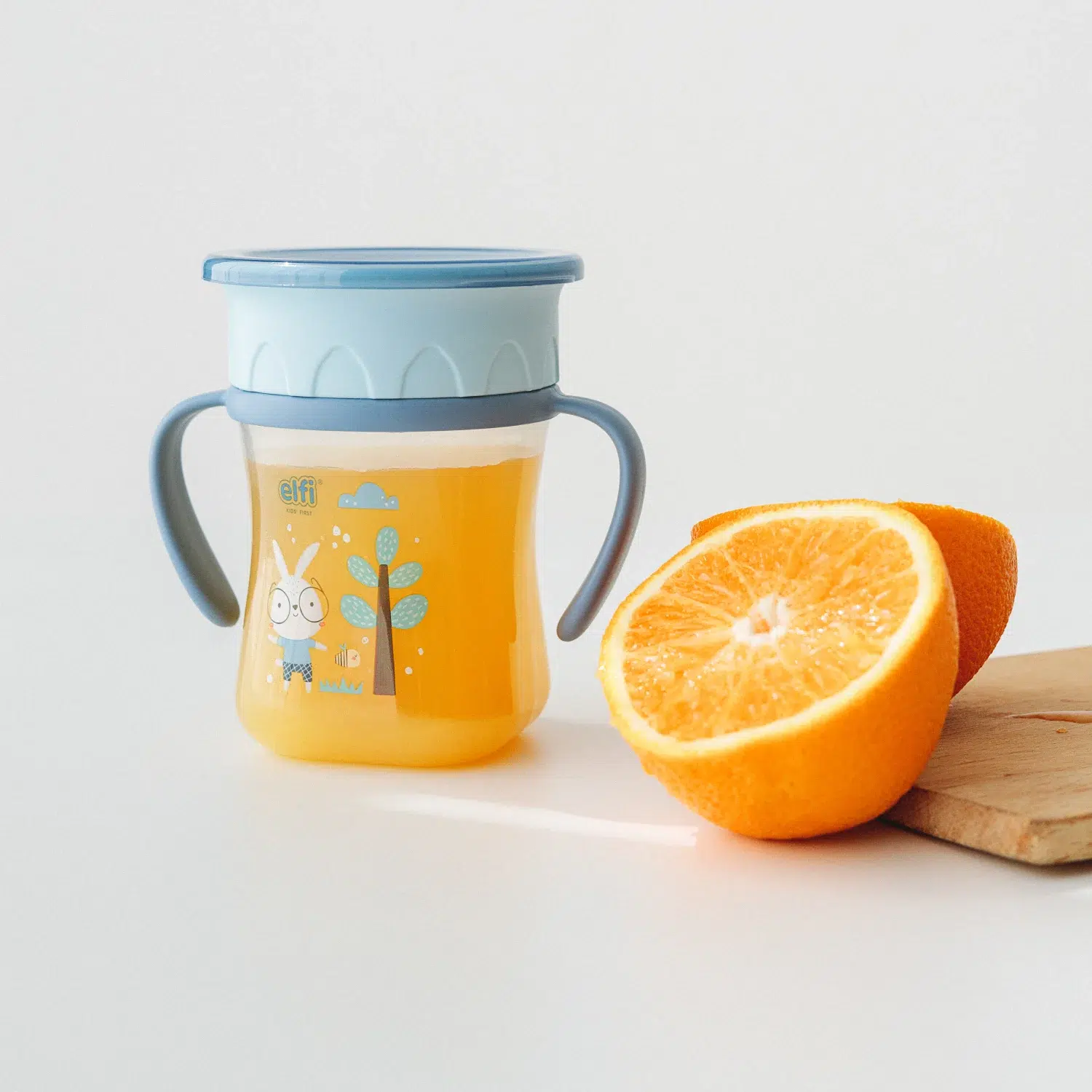 ELFI Magična neprosipajuća šolja, omogućava sigurno ispijanje tečnosti bilo gde na obodu šolje, uz pomoć silikonskog dela koji se pomera (spušta i podiže) kada je dete koristi.