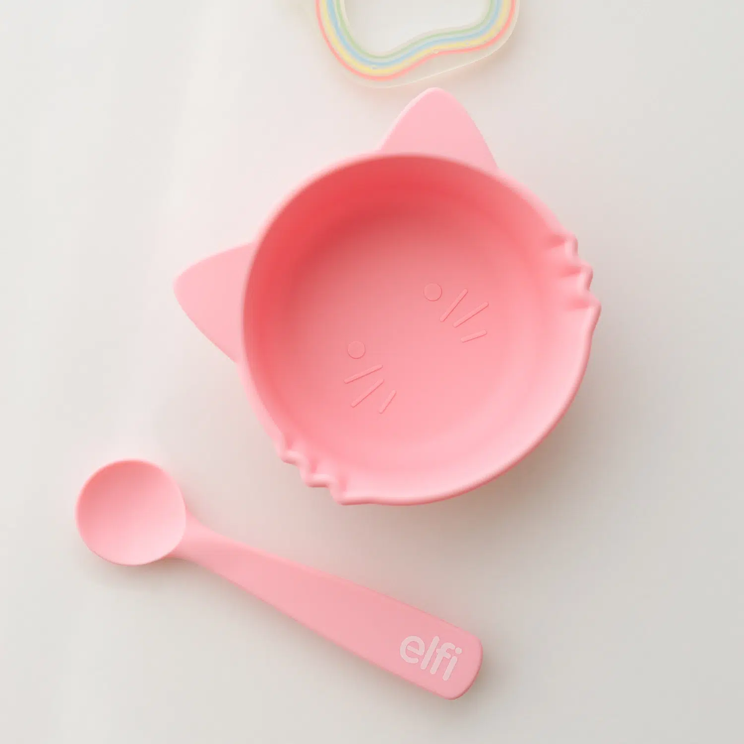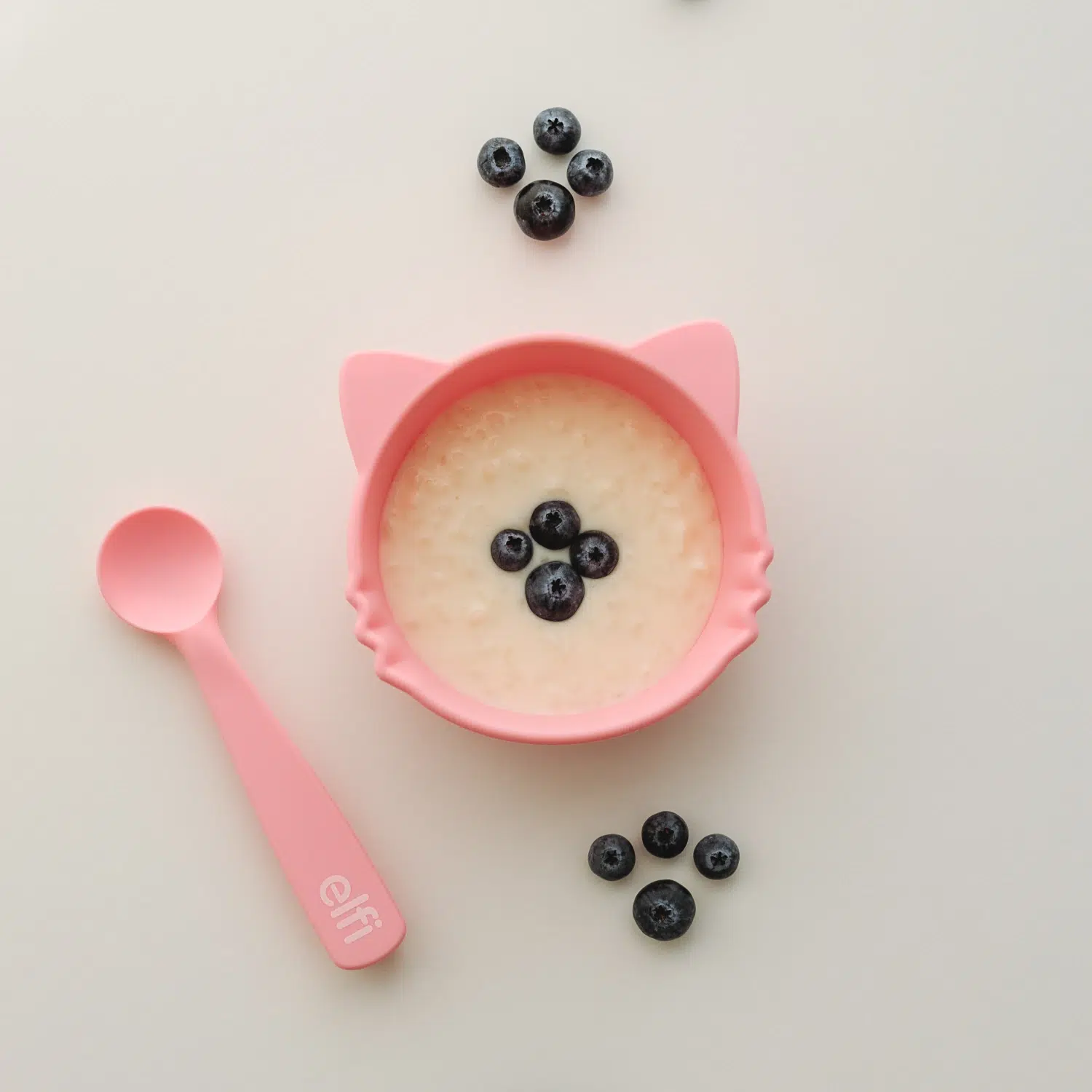 Elfi silikonska činija sa kašikom u obliku mace unosi radost u svaki obrok.