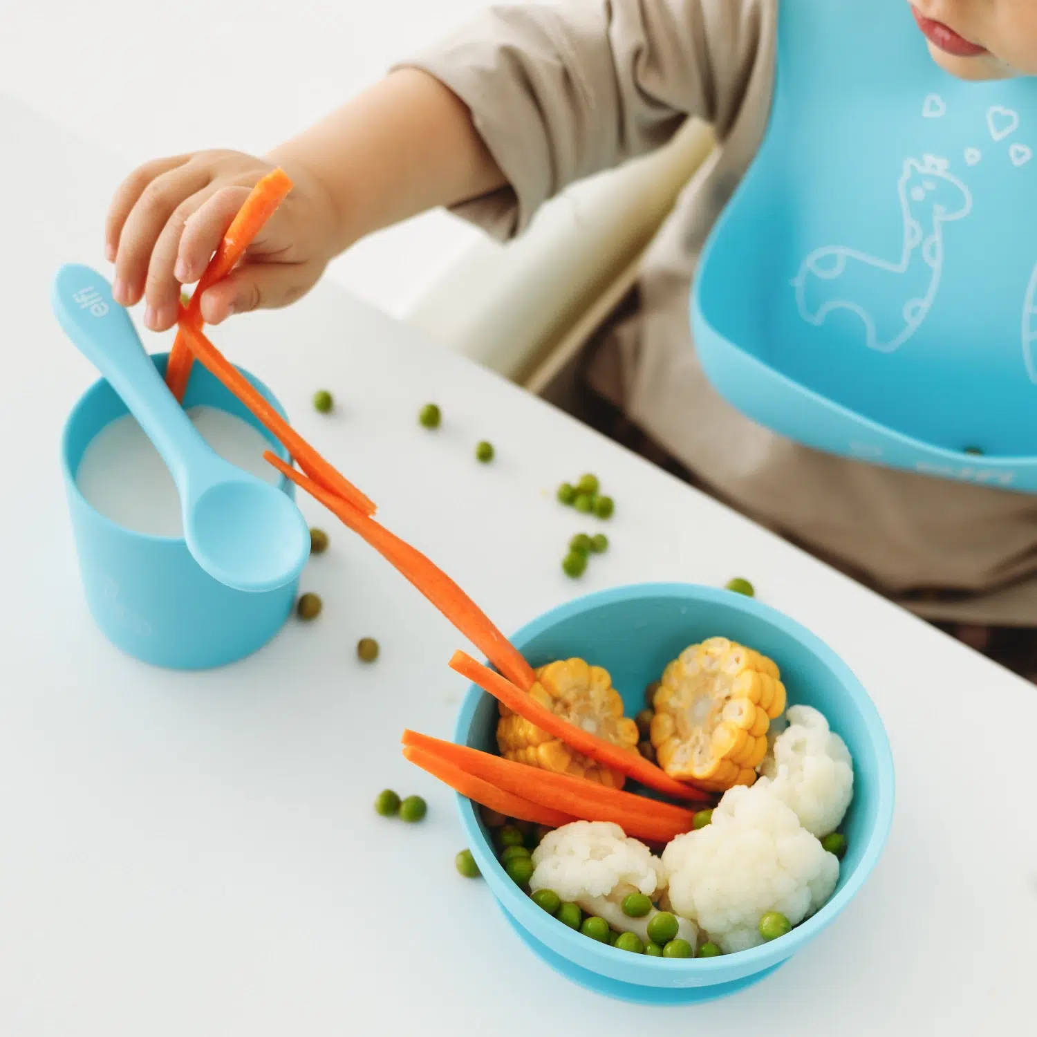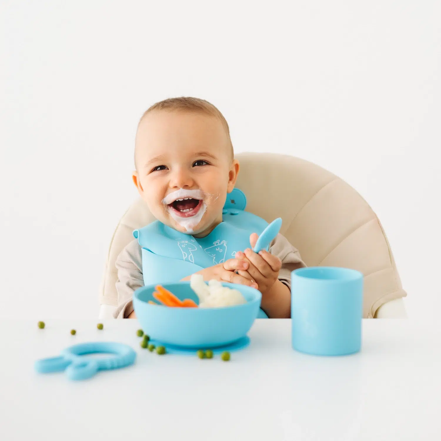 Elfi silikonska činija, šolja i kašika pružaju sve što je potrebno za prve obroke.