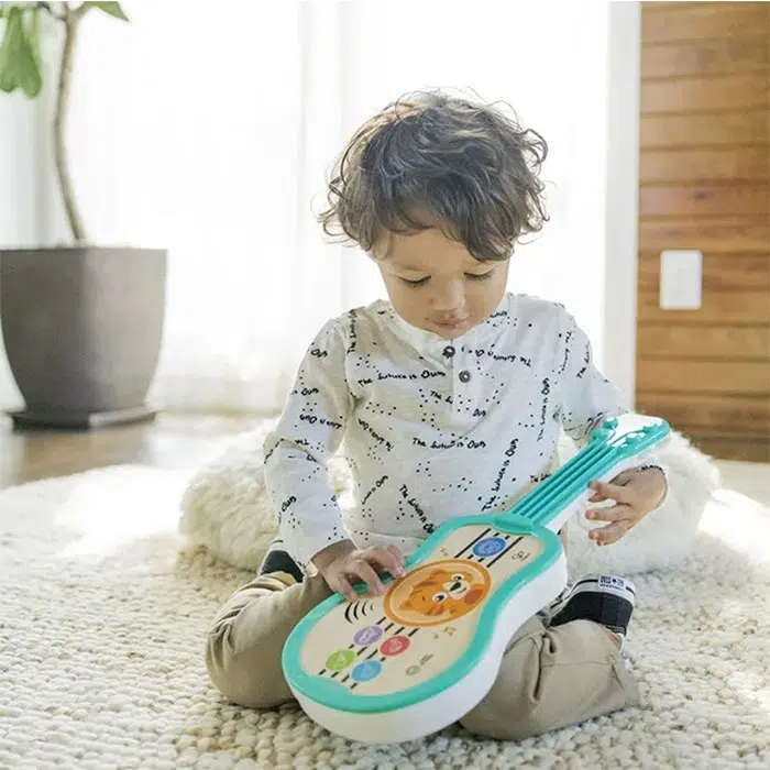 Uz 6 popularnih melodija i 4 različita zvuka (ukulele, bendžo, krava i patka), ova interaktivna gitara podstiče kreativnost, razvoj motorike i razumevanje uzroka i posledice.