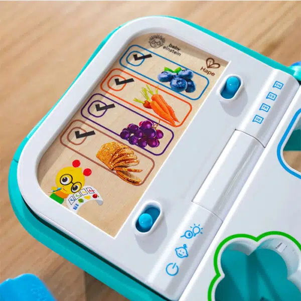 Set uključuje 4 namirnice – jabuku, brokoli, sir i mleko – dizajnirane u obliku osnovnih geometrijskih figura. Deca mogu sortirati namirnice u odgovarajuće otvore, pritiskati dugmiće i „naplatiti“ svoje namirnice, dok razvijaju finu motoriku i razumevanje uzroka i posledice.
