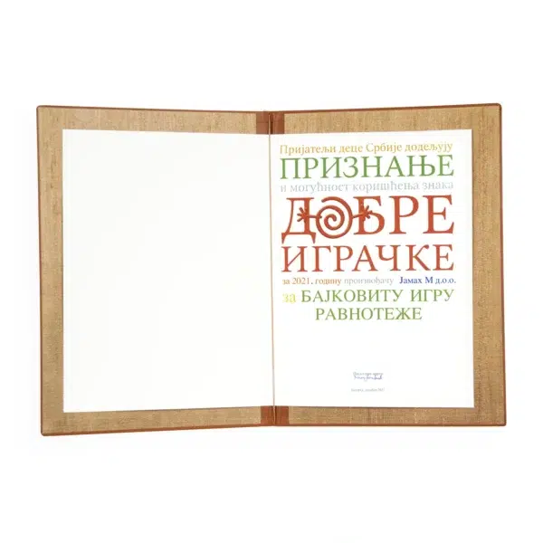 Bajkovita igra ravnoteže je više od igre – to je mala porodična predstava puna likova, priča i izazova. Dok dete gradi ravnotežu među figuricama, gradi i ravnotežu između igre, učenja i strpljenja. Za svoj kvalitet i kreativnost, ova igra je nagrađena priznanjem „Dobra igračka 2021“ koje dodeljuje Društvo prijatelja dece Srbije.