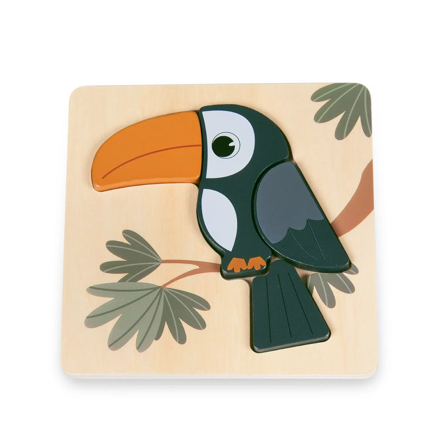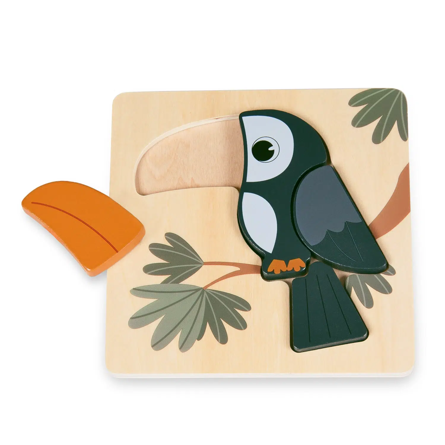 Dete postavlja četiri drvena dela u podlogu i otkriva veselog, šarenog tukana. Igra razvija koordinaciju oko–ruka, pažnju i razlikovanje boja. Zbog jarkih tonova i prijatnih oblika, ova slagalica privlači pažnju čak i najmlađih beba.