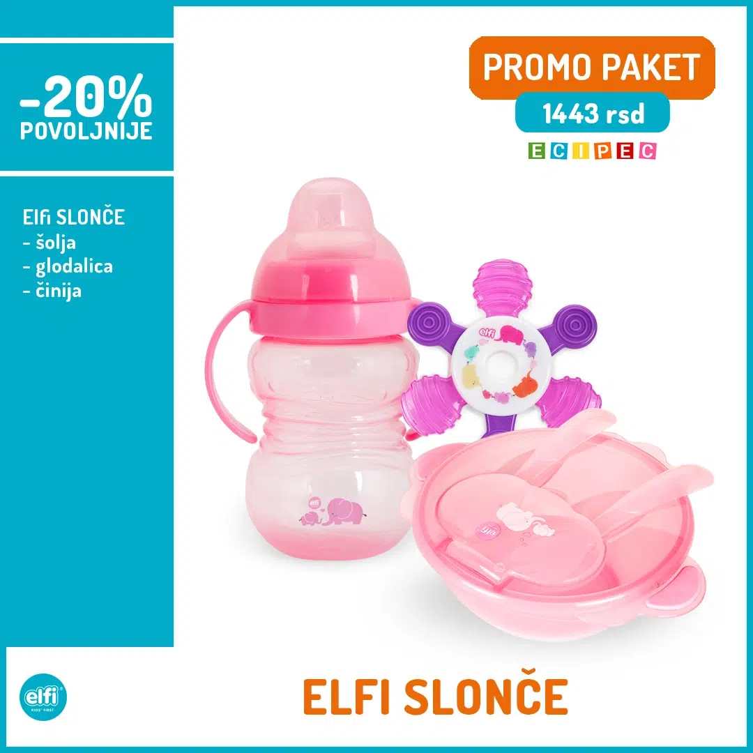 - Elfi ČINIJA SA ESCAJGOM – činija za bebe sa kašikom i viljuškom (redovna cena 858 din);