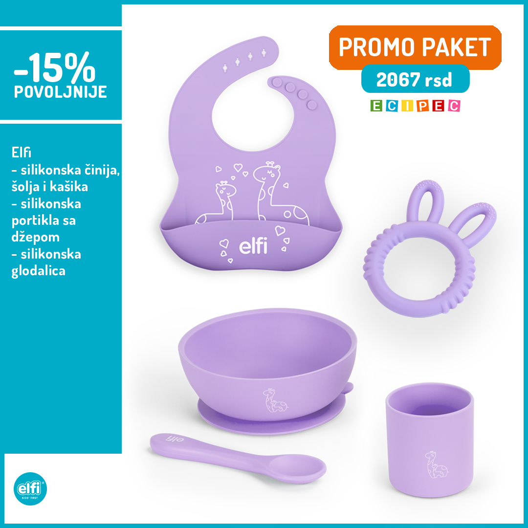 - Elfi ČINIJA SA ESCAJGOM – činija za bebe sa kašikom i viljuškom (redovna cena 858 din);