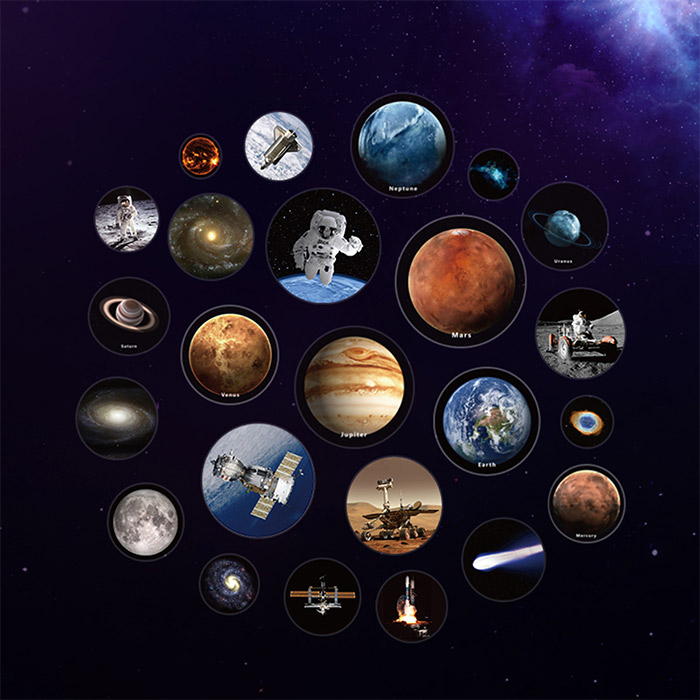 Edukativni set sadrži interaktivni 3D solarni sistem sa 8 pokretnih planeta i projektorom koji može prikazivati slike putem 3 diska za projekciju.