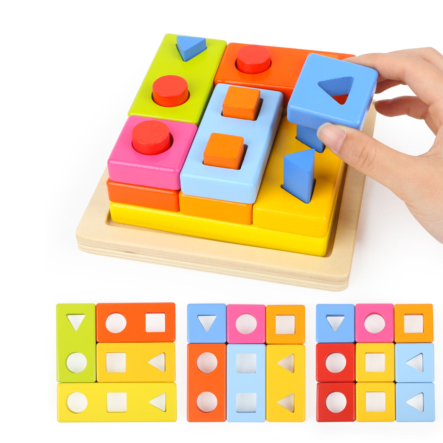 Dete ima zadatak da složi drvene elemente sa otvorima u obliku geometrijskih tela u 3 ravni, slagajući ih na vertikalne, geometrijske držače, i to tako da svi poslagani čine pravilan kvadratni oblik.